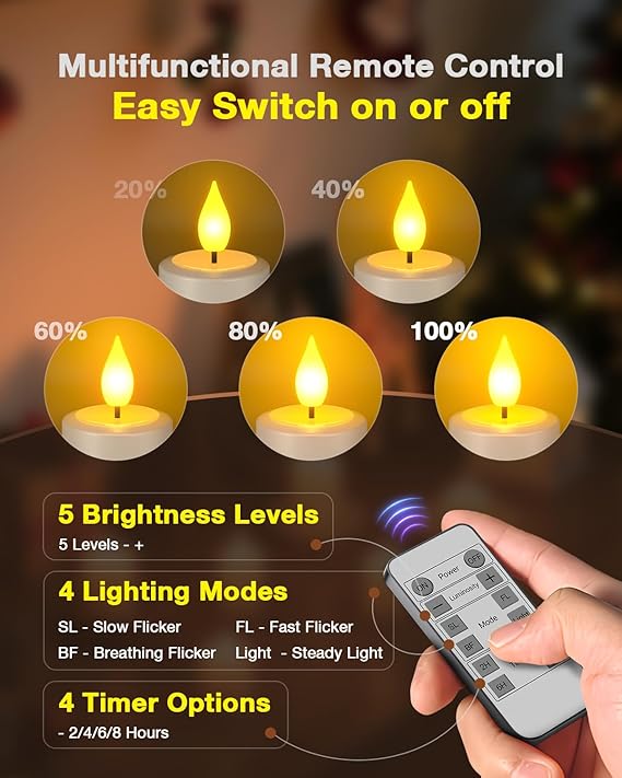 - REMOTE CONTROL TEA LIGHTS: Comes with a 12-Key Remote, which is simple and convenient to use, no need to manually turn on and off, You can also Set 2/4/6/8 Hours auto Timer, Increase and Decrease the Brightness, Control the Flickering Speeds, Select the Light Mode, such as Always ON and Breathing Flickering like real tea lights candles